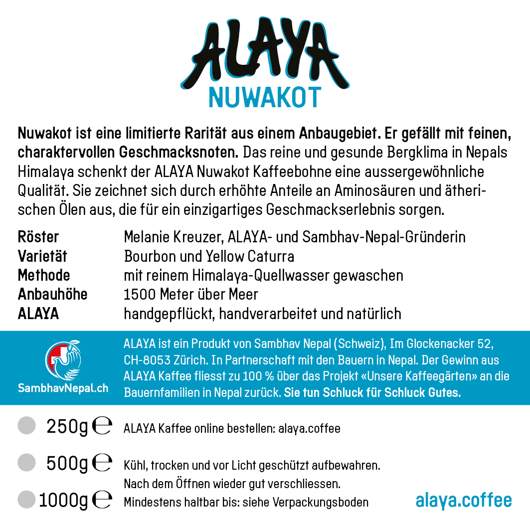 Das reine und gesunde Bergklima in Nepal’s Himalaya schenkt unserer Kaffee-Bohne eine aussergewöhnliche Qualität. Sie zeichnet sich durch erhöhte Anteile an Aminosäuren und ätherischen Ölen aus, welche die Grundlage sind für das einzigartige Geschmackserlebnis des ALAYA.