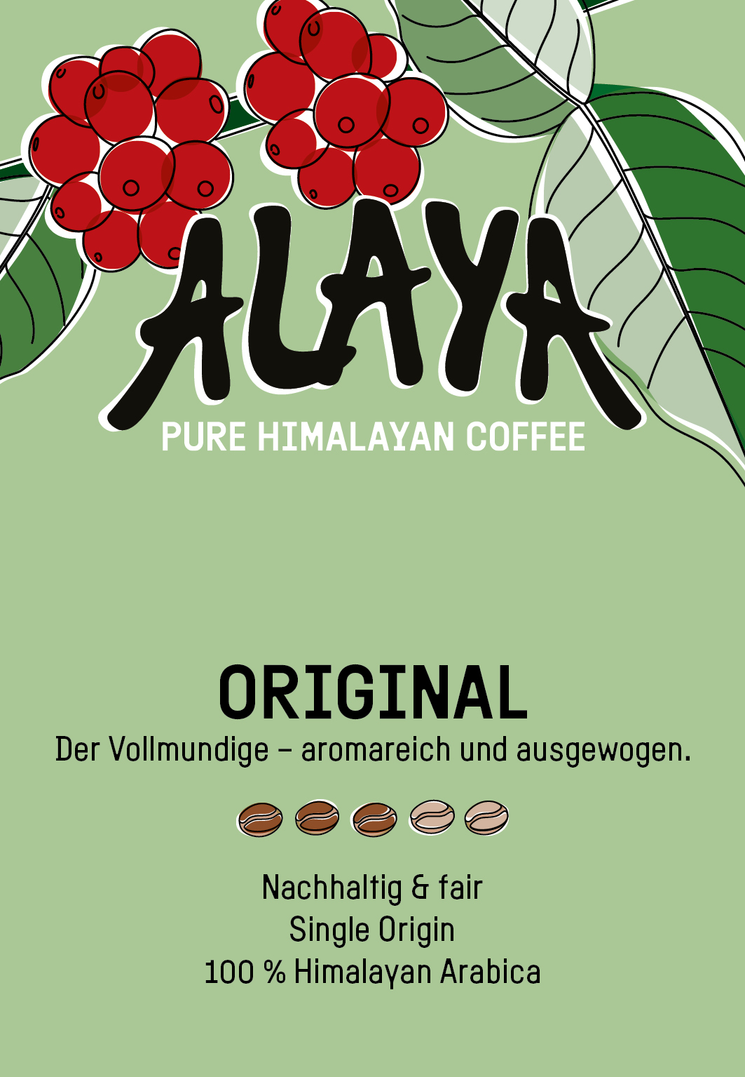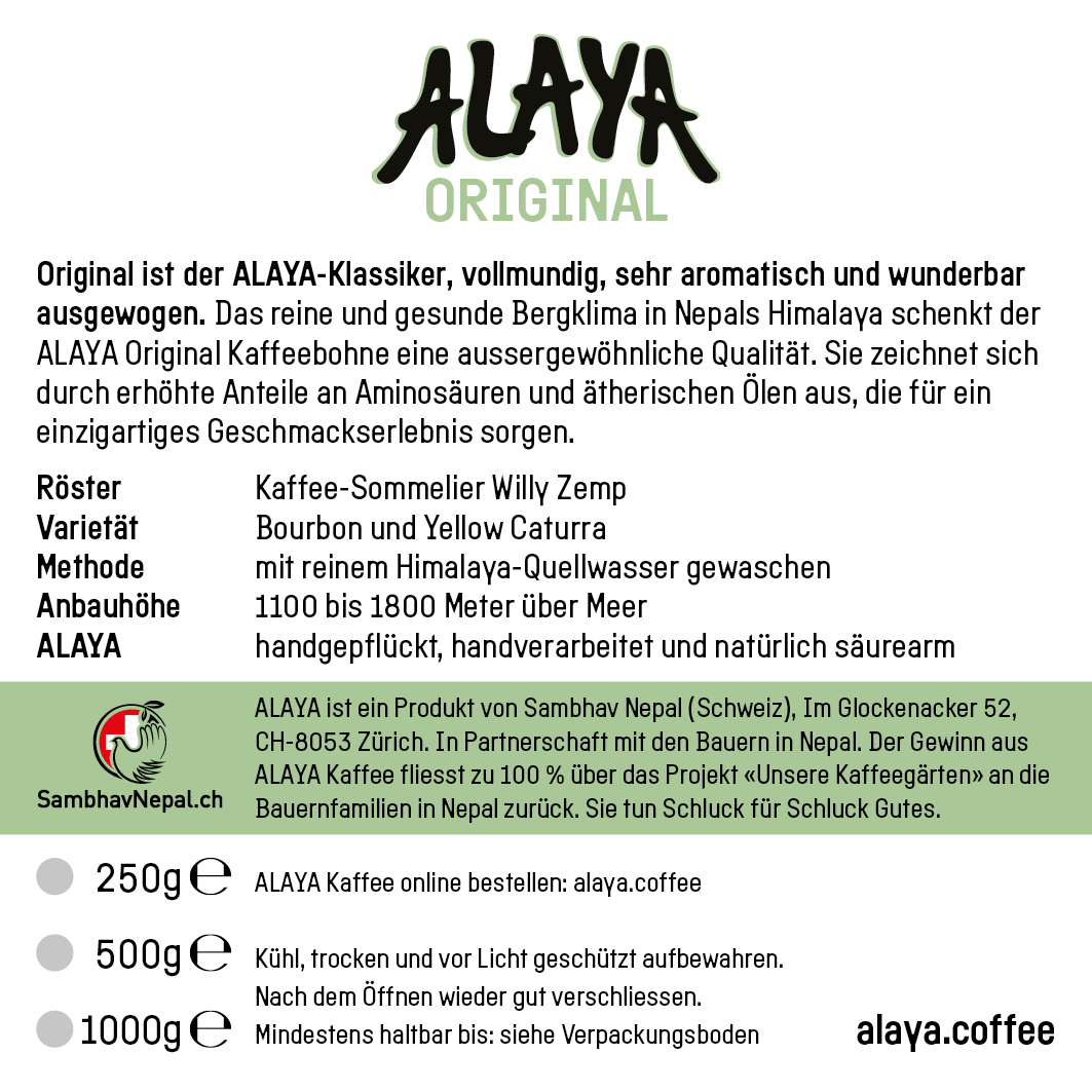 Das reine und gesunde Bergklima in Nepal’s Himalaya schenkt unserer Kaffee-Bohne eine aussergewöhnliche Qualität. Sie zeichnet sich durch erhöhte Anteile an Aminosäuren und ätherischen Ölen aus, welche die Grundlage sind für das einzigartige Geschmackserlebnis des ALAYA.