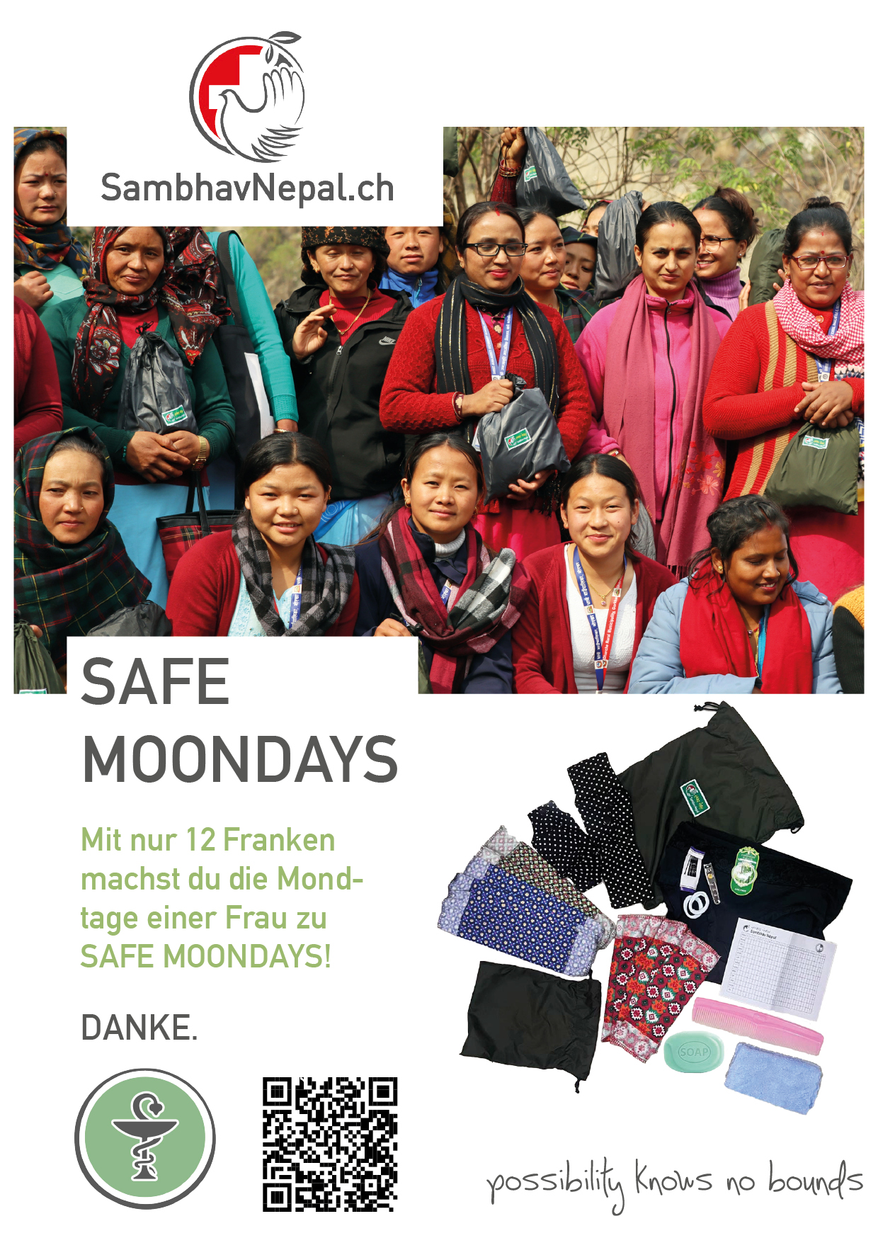 Wir produzieren die SAFE MOONDAYS Kits vor Ort in Nepal (Einkommen für Einheimische). Bei der Verteilung informieren wir über Gesundheit, Hygiene und beauftragen Krankenschwestern für Frauengesundheits-Workshops. Alles zusammen in unserem Projekt SAFE MOONDAYS.